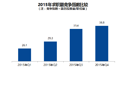 從過去一年的整個年度的競爭指數來看,從第一季度的26.1,第二季度的29.3,到第三季度的35.4,以及第四季度的36.8,可以看出2015年冬季的競爭指數繼續保持上升的趨勢,尤其是從下半年開始,整個求職市場競爭激烈,形勢比較嚴峻。